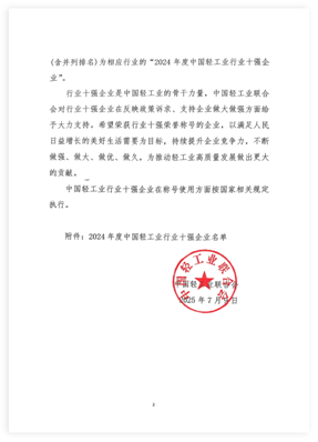 2025年7月9日,中國輕工業(yè)聯(lián)合會發(fā)布《中國輕工業(yè)行業(yè)十強企業(yè)統(tǒng)計評價結(jié)果公告》(中輕聯(lián)信統(tǒng)(2025)136號),發(fā)布了我國輕工業(yè)各行業(yè)的“2024年度中國輕工業(yè)行業(yè)十強企業(yè)”名單。